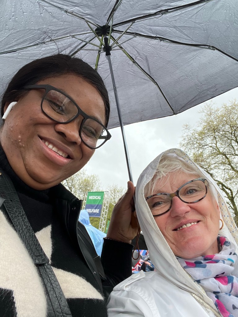 Even with the rain that soaked to the skin everyone enjoyed the experience very much. Lots of cheering and singing and people generally in good spirits from all over the world including a lovely lady from Cameroon called Blandina who lives in London and shared her brolly with Ma.