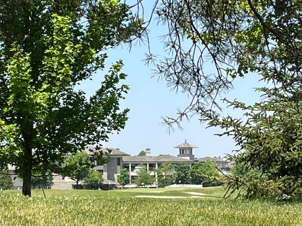 Of course she couldn’t get in but nonetheless took a few photos though the fence to show the glory of the clubhouse and the course.