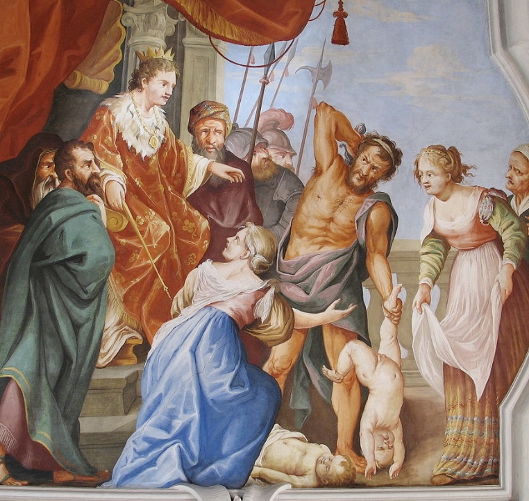 The false Mom agreed with him but the true Mom went into hysterics pleading with him to give the child to the other women as she could not face seeing her baby hurt.