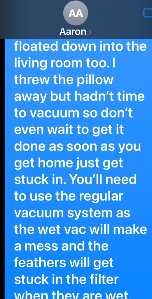 Ma grabbed the pillow and ran with it to the trash that had yet to be collected. The remainder is history but here’s the text to the bro!!!!! Put it like this Dads wrath was GREAT!!!!!