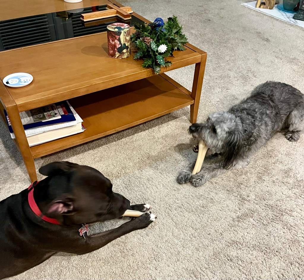 We got lots of bones for Christmas. One of them with a mint center was meant to last hours. The niece and me each got one and we both devoured it in minutes.