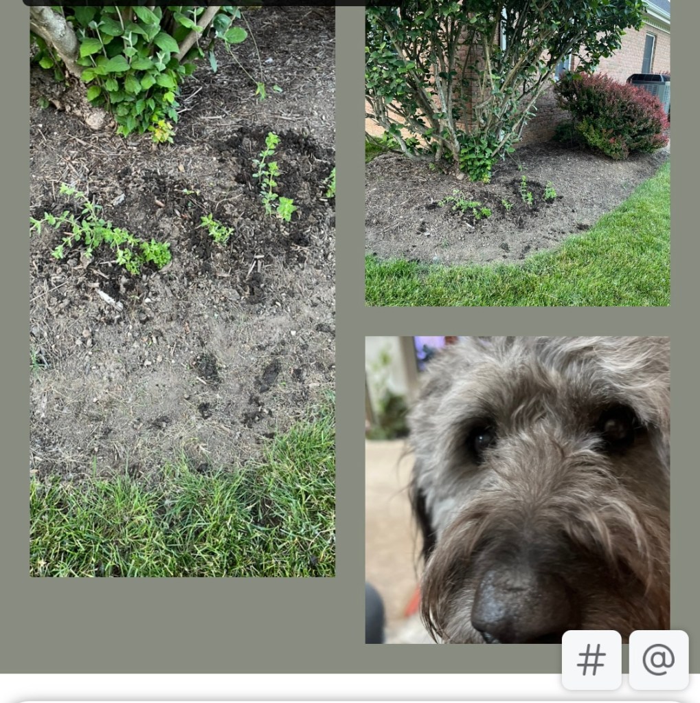 Auntie Denise has been working non stop in her yard and brought us some oregano that we dibbled in under a big viburnum bush.