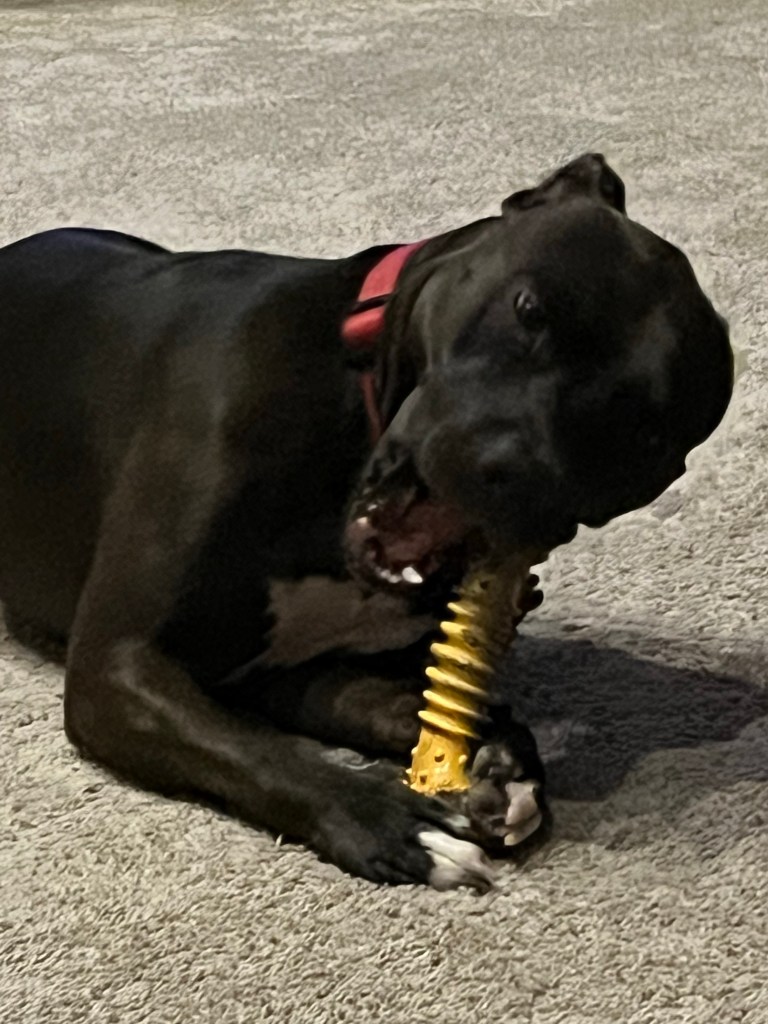 I partake of some rehydration and maybe a tiny treat if one is available if not I gnaw the Nyla for a few minutes.