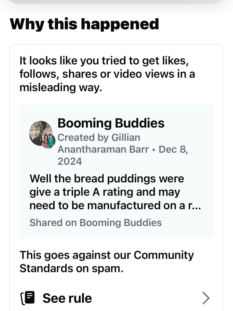 Read again the message from facebook and compare the acceptable text in take two with the one above and you will have understood the “issue”