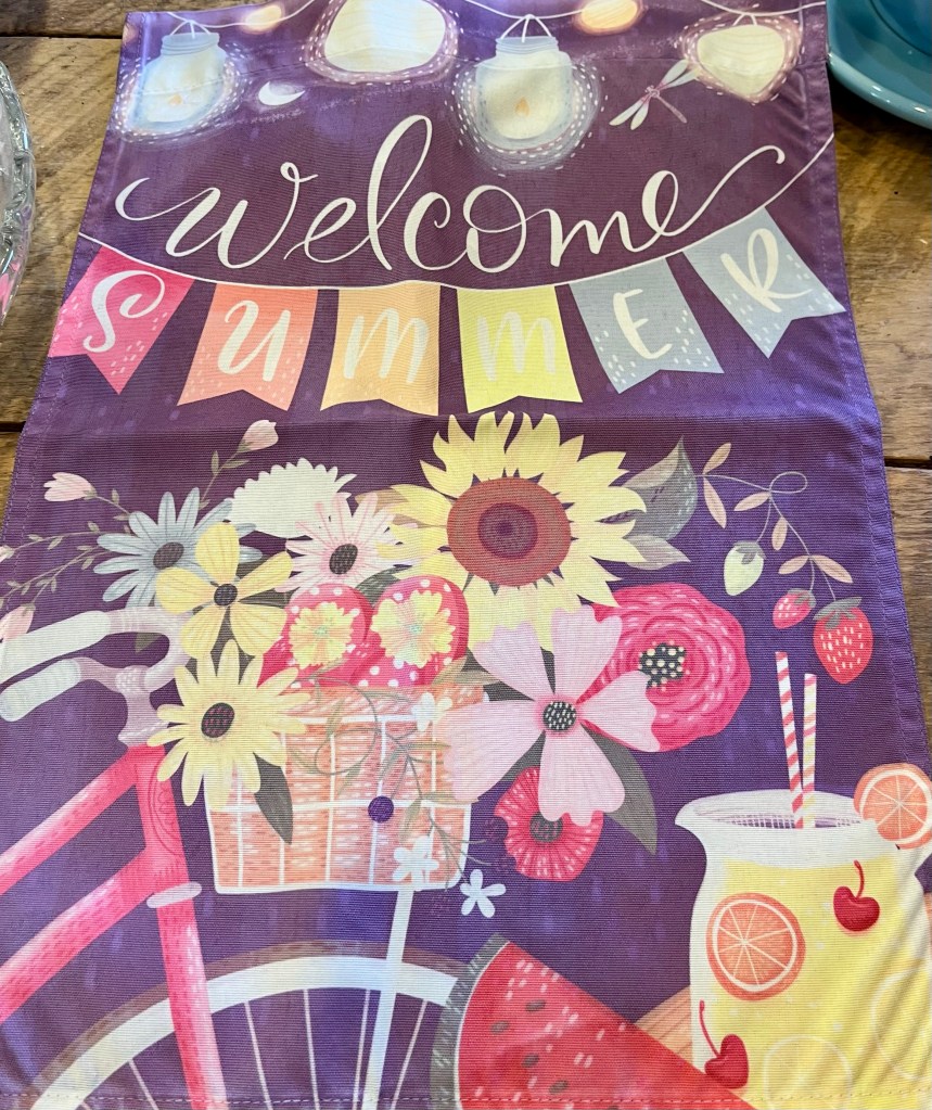 Add to this a sweater cape combo, a fancy top, some yarn to crochet for her nerves, two table runners for the tearoom and a sweat shirt for the bro. Most importantly a WELCOME SUMMER sign for the yard!