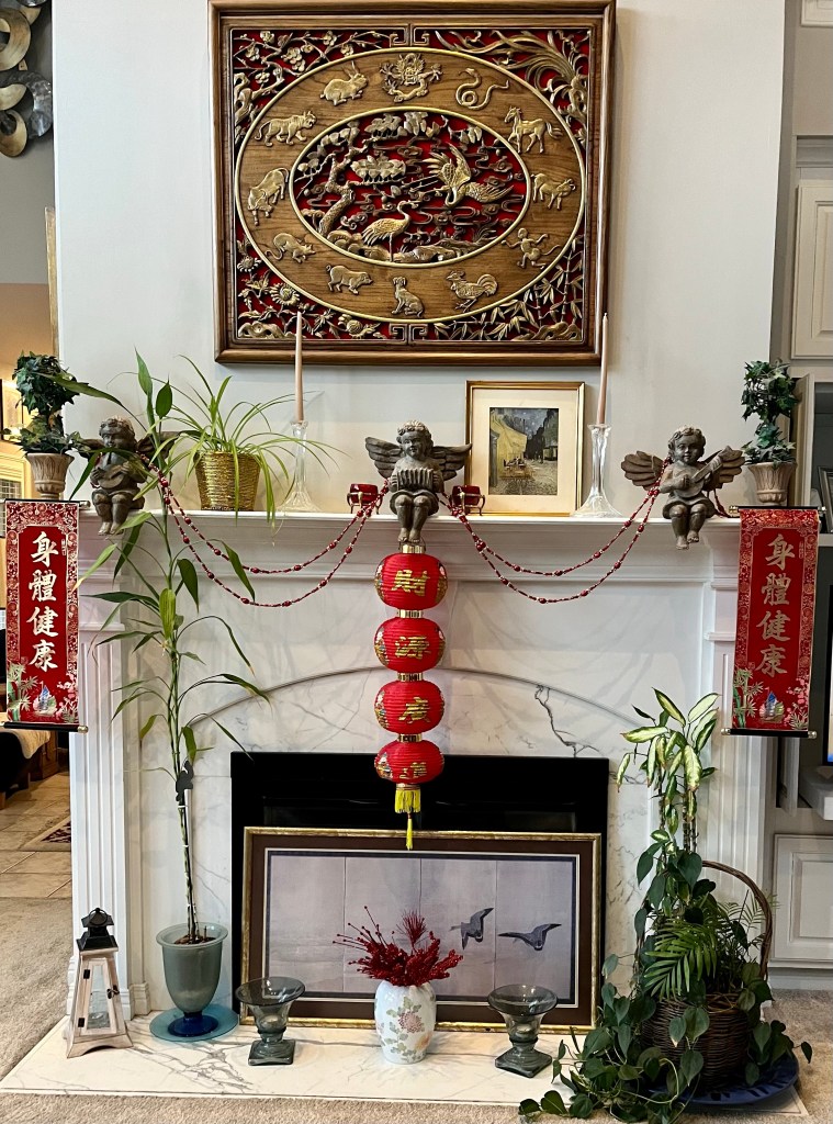 Ma has bedecked the front door with red ornaments for good luck and as always the fireplace is festooned with auspicious sayings that someone more skilled in the language can translate.