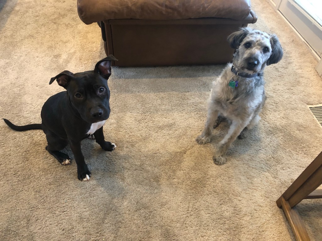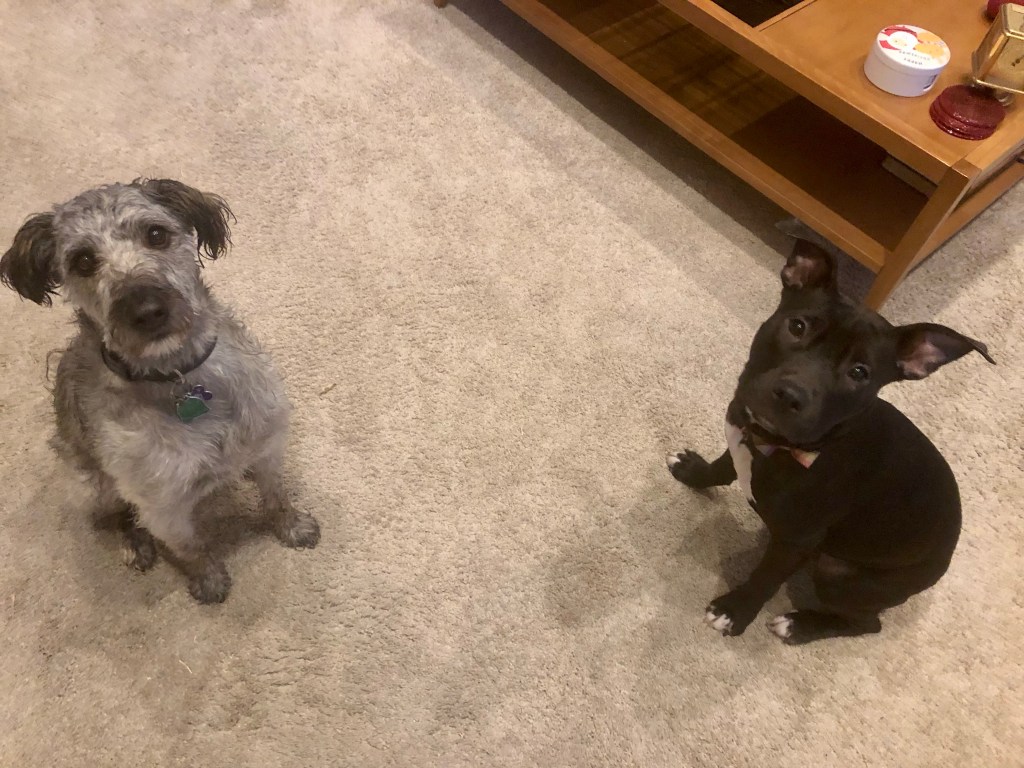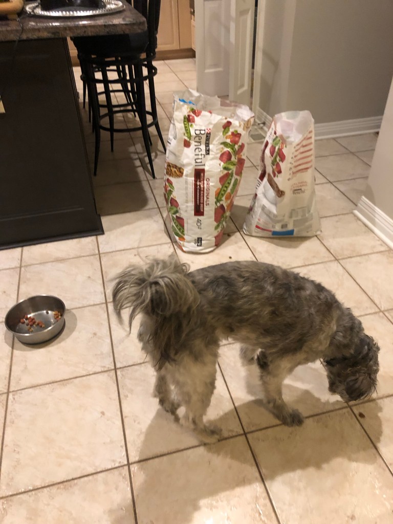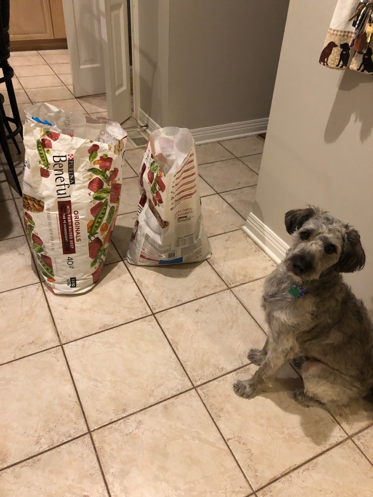 We restock the small one from the big one and usually this routine happens in the garage. With temperatures at 20F this morning it was a tad too chilly for poor Ma to stand there scooping kibble from one bag to another at 6:30am.