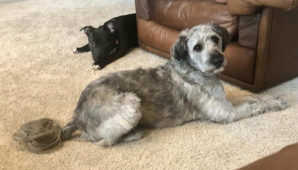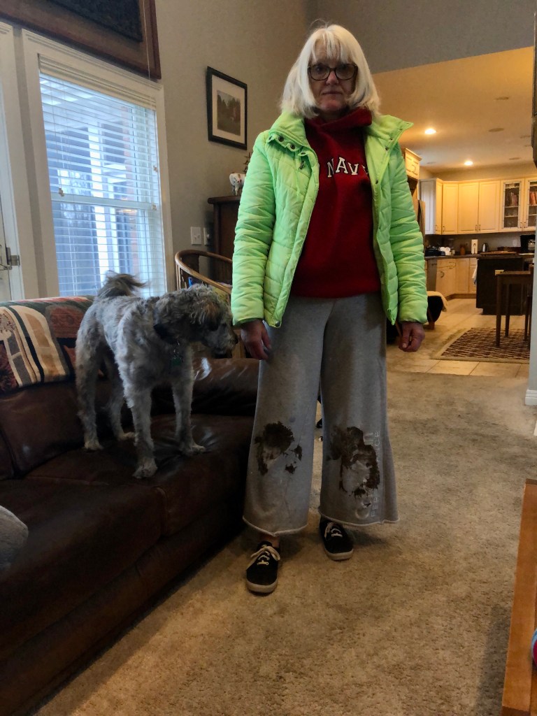 Yesterday we (make that I) pulled her off her feet trying to chase our neighbors car as she left for work. She was in the process of picking up the Princess’s poop in our yard and fell into the drainage ditch. Fortunately not into the horrifically smelly material the creature emits.