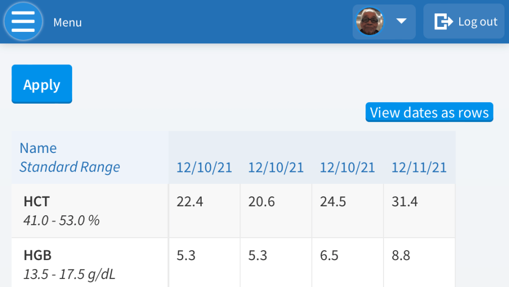 Well that was until we got the results. They came in just as Ma got home from work. Everything looked great with lipids and minerals and all those good things. EXCEPT his hemoglobin was extremely low. Ma was pondering what to do when the doctor who monitors clinical chemistry at the laboratory called.