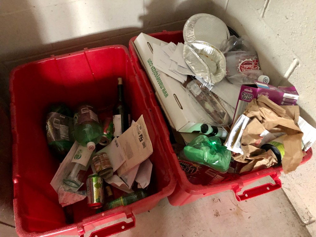 We usually fill our two red recycling bins each week and only have one small trash bag for the landfill.