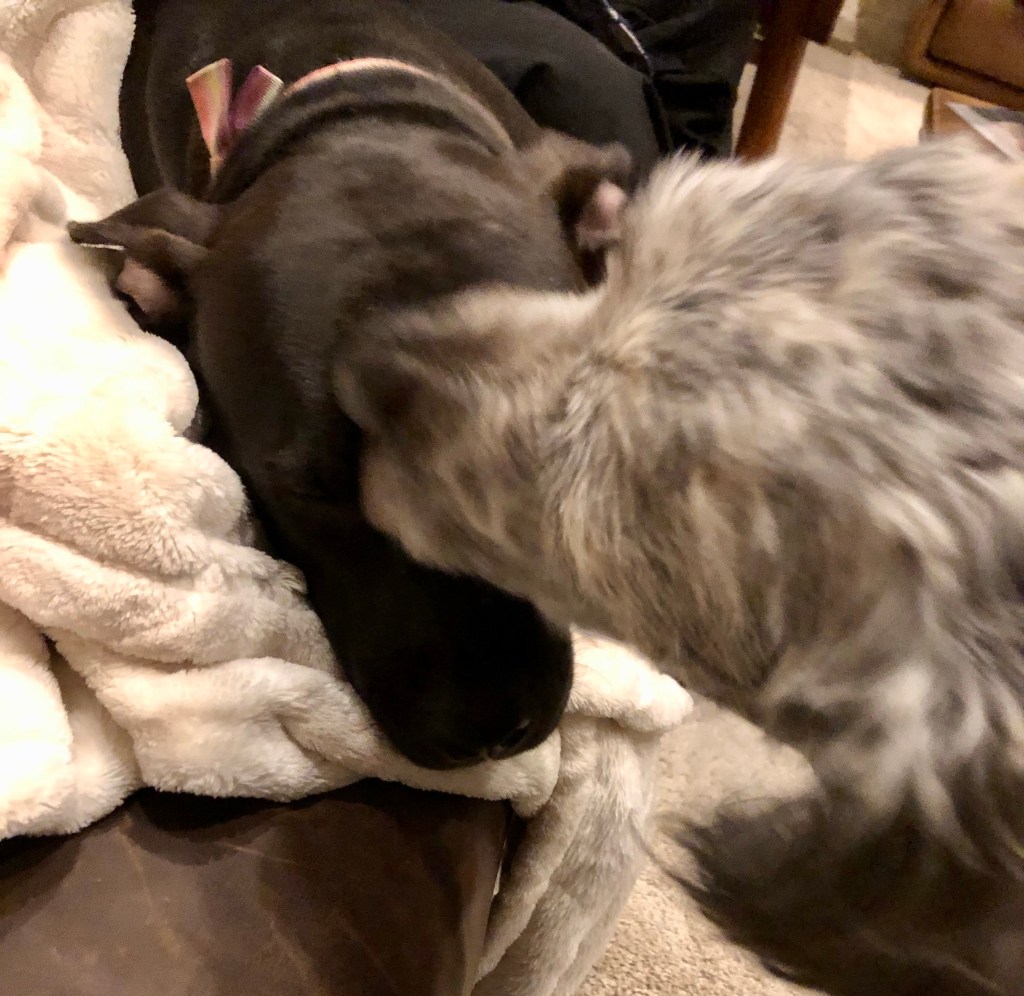 Now I was worried. Ma said I had to be super soft with her as she has stitches in her belly. Seems a bit young and skinny to me for a tummy tuck but maybe they did a gastric bypass to economize on kibble!