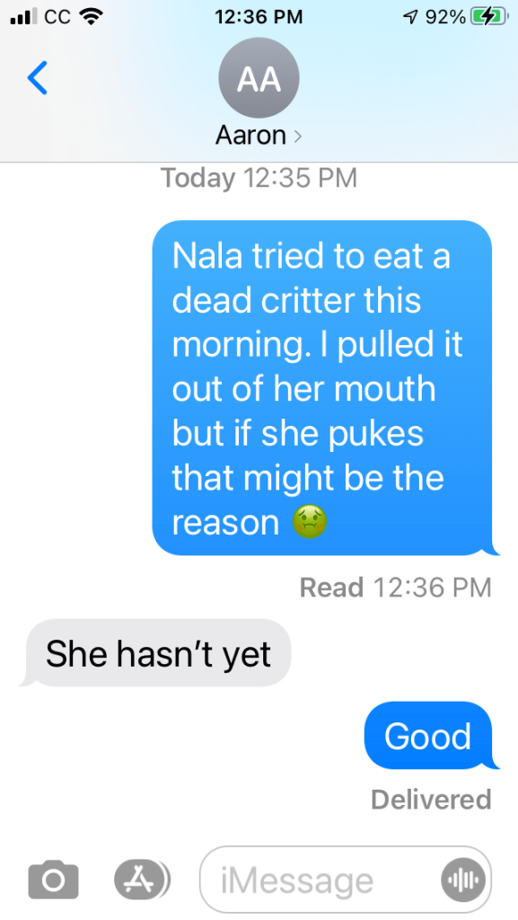 She says to me “now Scooby you’re a good boy and I want you on your very best behavior because Nala is spaced out”