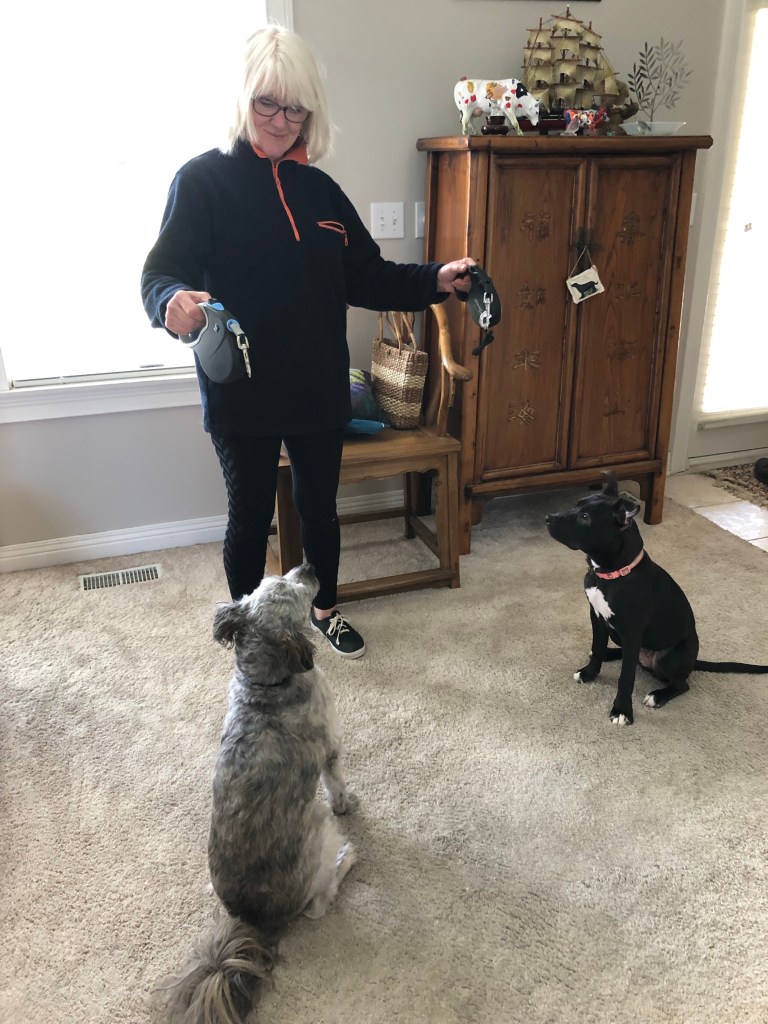 She went shopping and is now back with two retractable leashes for monster dogs.