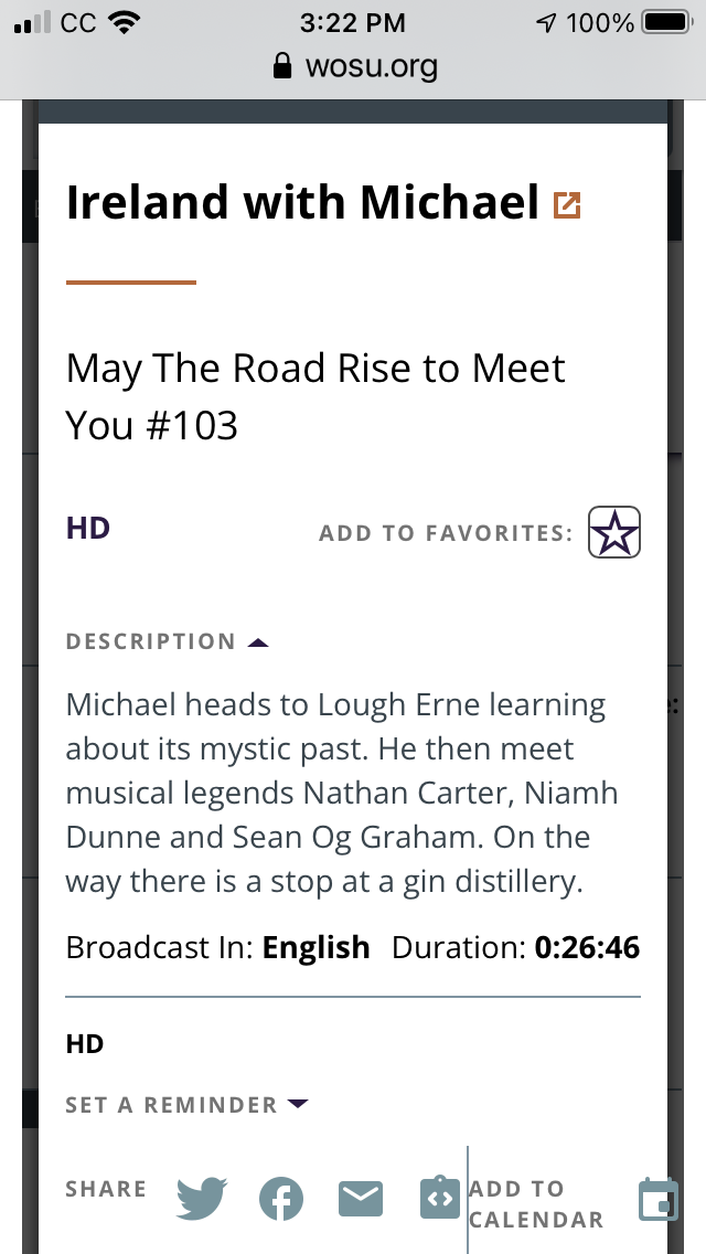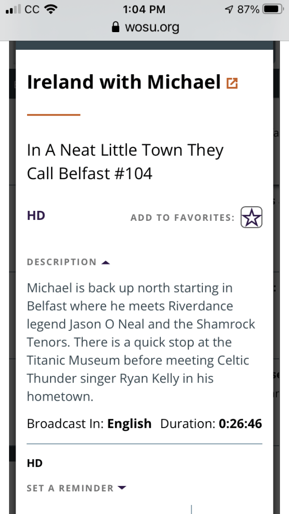 Ma discovered that PBS was running a full afternoon of programs on Ireland.