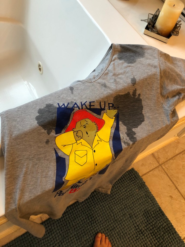 She said the state of her nighty that was underneath reminded her of wet T-Shirt contests when she and her mates went to Spain to party. Made her chuckle. Especially since good old Paddington has on his sowester.