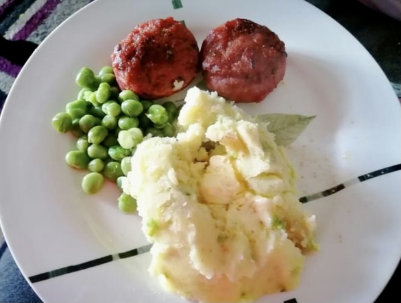 This morning there was a post for a very traditional Northern Irish dinner. It was composed of champ, in other words creamy mashed potato loaded with scallions and butter, peas and vegetable roll. The later is a sausage like composition that is unique to the province.