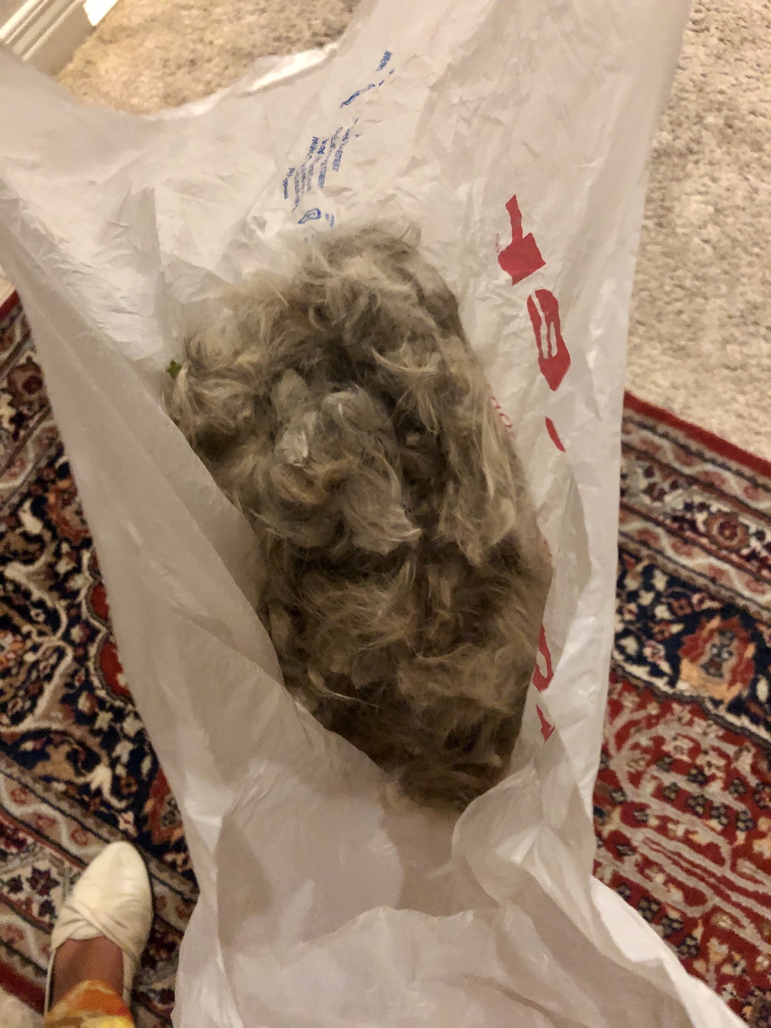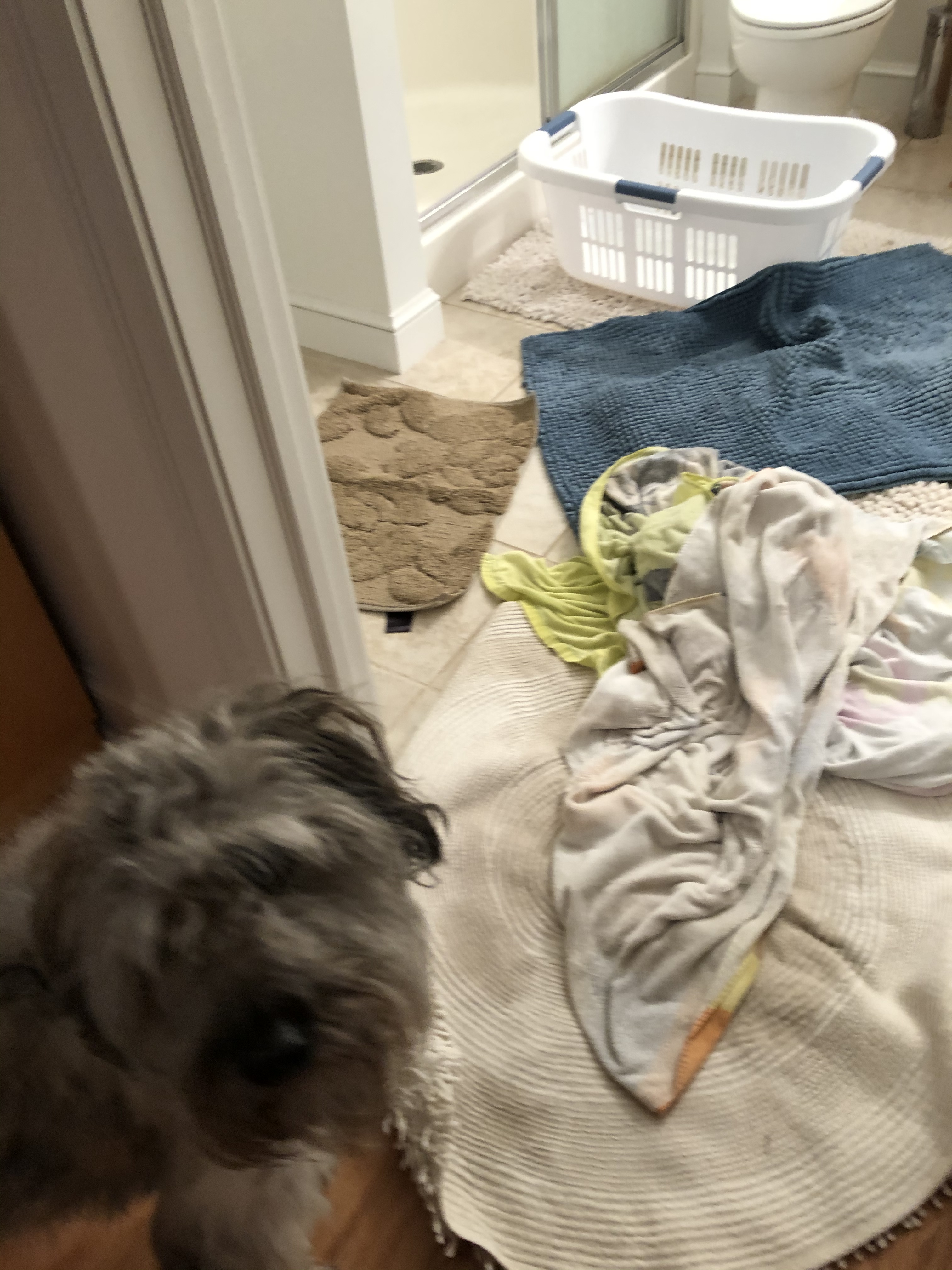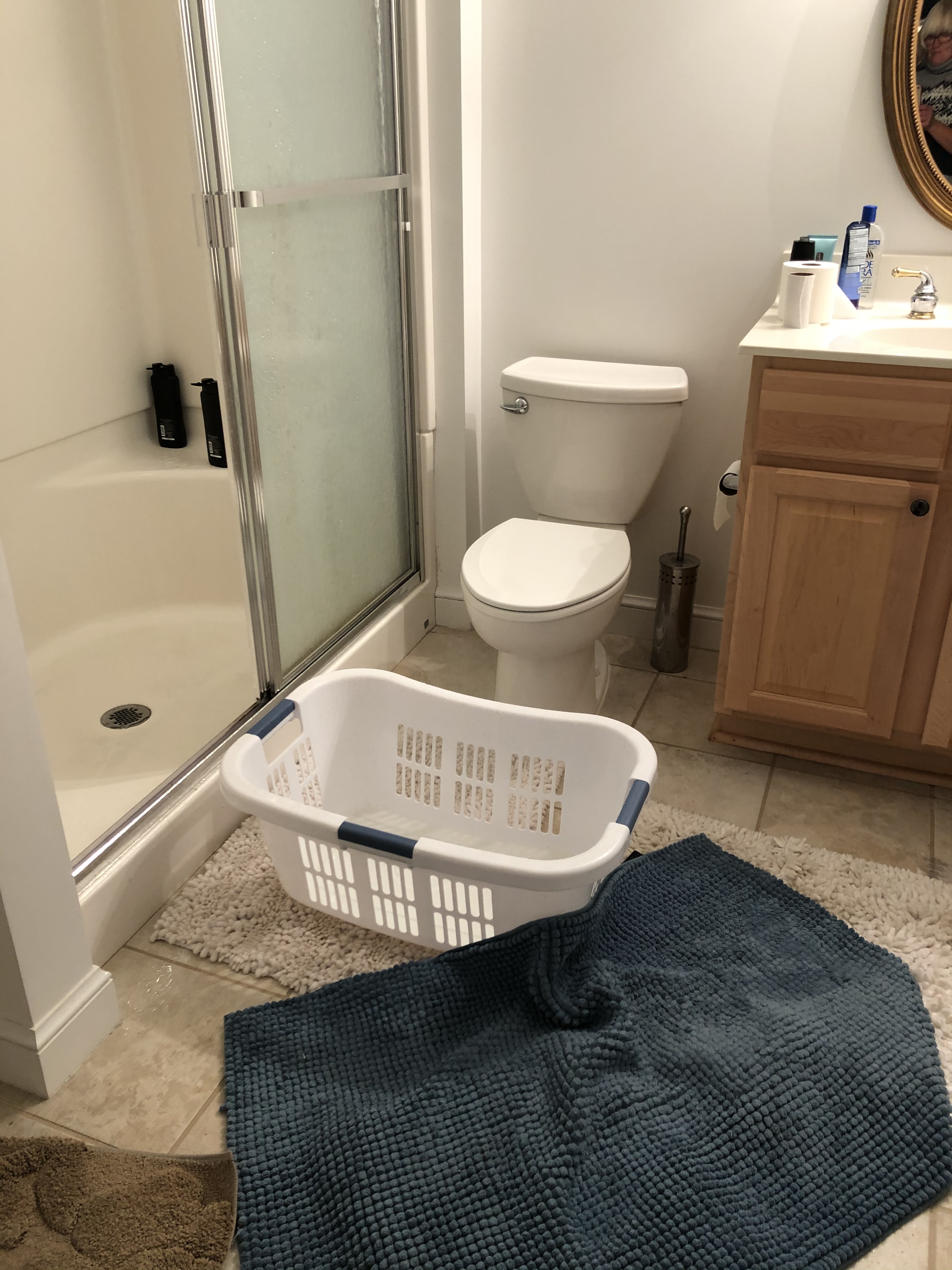 It took all the available towels and bathroom mats to soak it up. The only receptacle to hand was a laundry basket go she grabbed that but heavens she is not the brightest candle. Wouldn’t you know when she tried to empty it into the shower she poured all the water through the side holes!